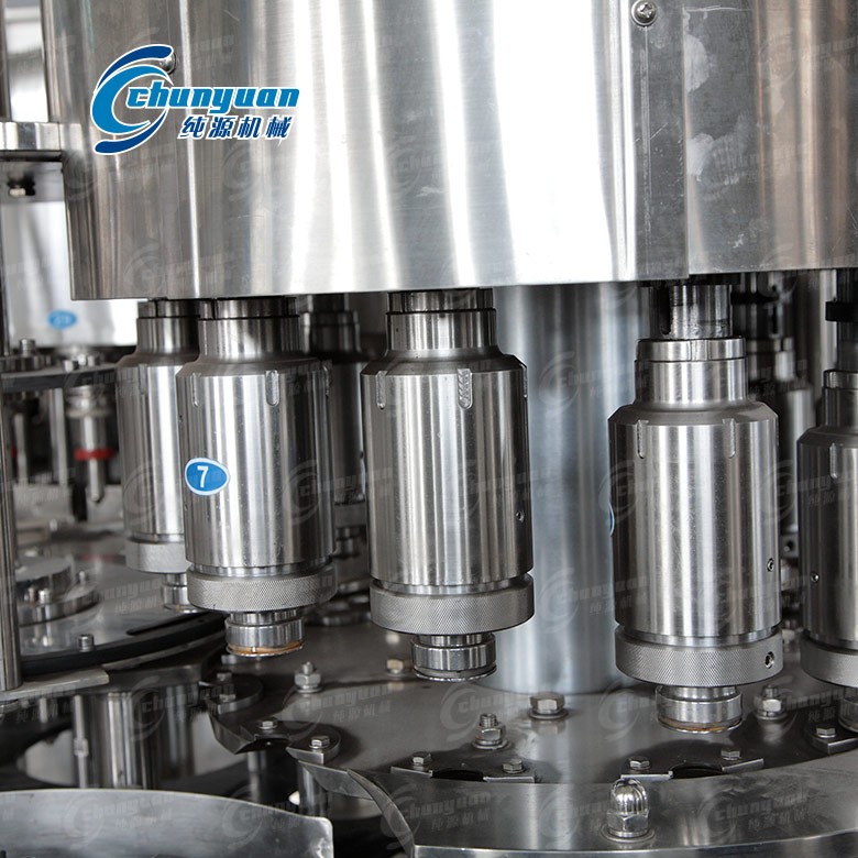 进入水精品麻豆视频网设备的瓶子由瓶颈托板卡住并在凸轮作用下将瓶子上升,然后由瓶口将精品麻豆视频网阀顶开。精品麻豆视频网采用重力精品麻豆视频网方式。精品麻豆视频网阀打开后物料通过精品麻豆视频网阀完成精品麻豆视频网过程,精品麻豆视频网结束后瓶口下降离开精品麻豆视频网阀,瓶子通过卡瓶颈过渡拨轮进入旋盖机。旋盖机上的止旋刀卡住瓶颈部位,保持瓶子直立并防止旋转。旋盖头在旋盖机上保持公转并自转,在凸轮作用下实现抓盖、套盖、旋盖、脱盖动作,完成整个封盖过程。成品瓶通过出瓶拨轮从旋盖机传送到出瓶输送链上,由输送链传送出纯净水三合一精品麻豆视频网机。