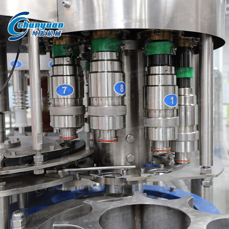 纯净水设备的瓶子由瓶颈托板卡住并在凸轮作用下将瓶子上升,然后由瓶口将精品麻豆视频网阀顶开。精品麻豆视频网采用重力精品麻豆视频网方式。精品麻豆视频网阀打开后物料通过精品麻豆视频网阀完成精品麻豆视频网过程,精品麻豆视频网结束后瓶口下降离开精品麻豆视频网阀,瓶子通过卡瓶颈过渡拨轮进入旋盖机。旋盖机上的止旋刀卡住瓶颈部位,保持瓶子直立并防止旋转。旋盖头在旋盖机上保持公转并自转,在凸轮作用下实现抓盖、套盖、旋盖、脱盖动作,完成整个封盖过程。成品瓶通过出瓶拨轮从旋盖机传送到出瓶输送链上,由输送链传送出纯净水三合一精品麻豆视频网机。